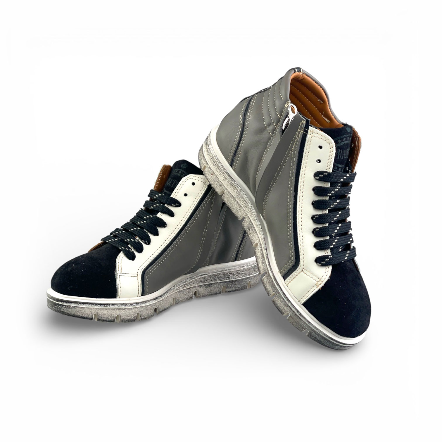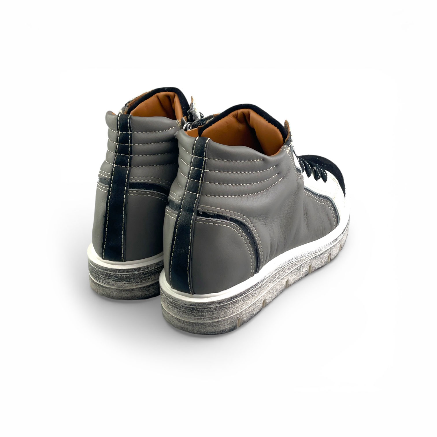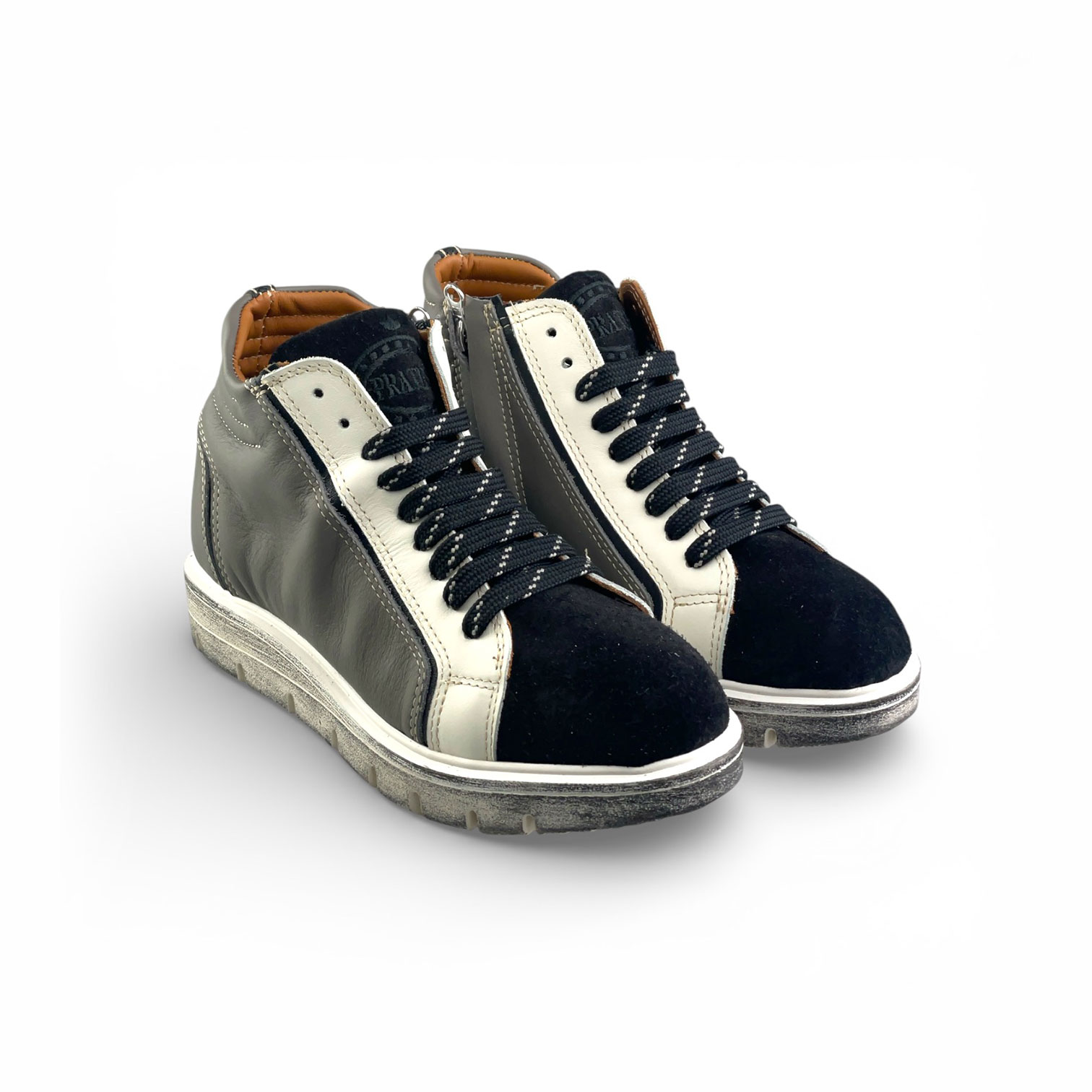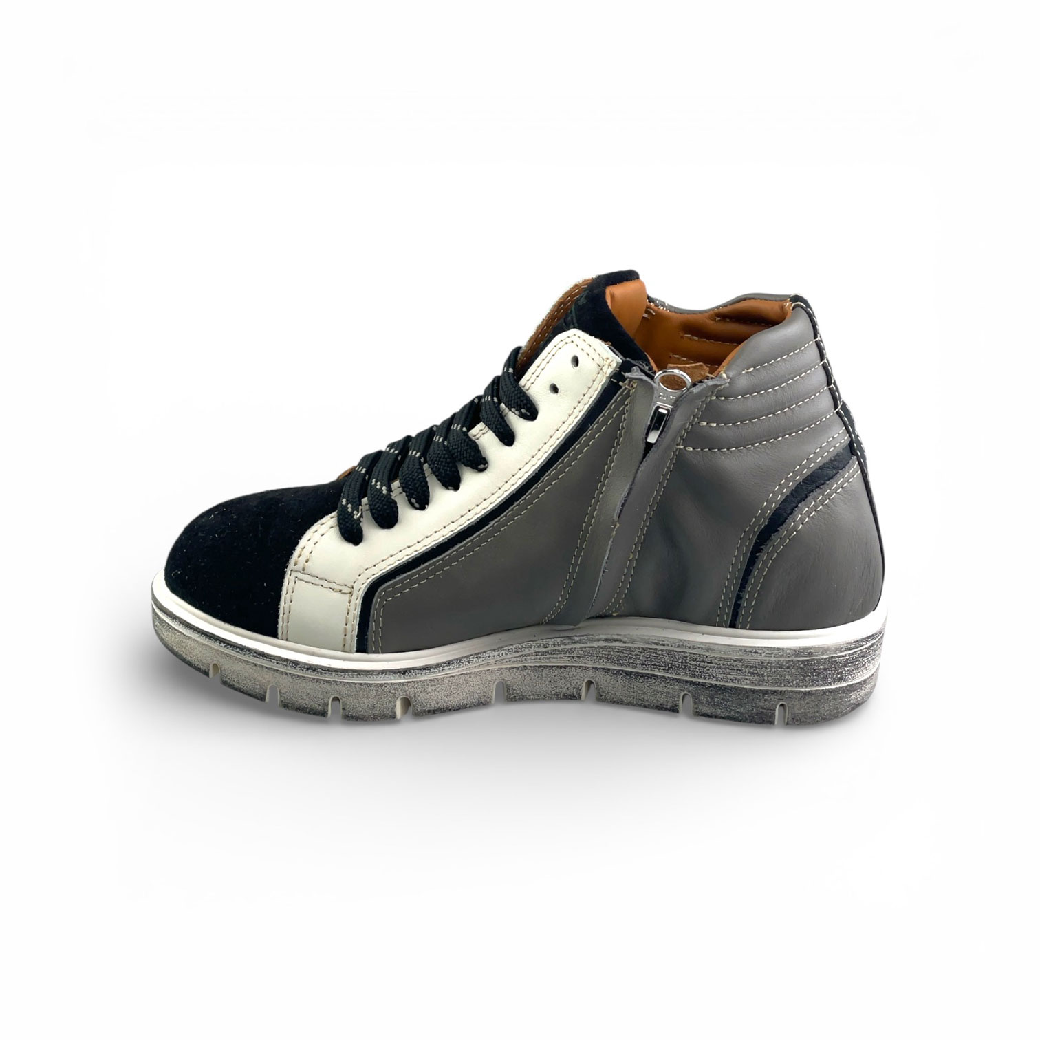 Calzatura Evelyne in pelle con apertura zip laterale e con suola in gomma bianca (Nero + Grigio + Bianco)